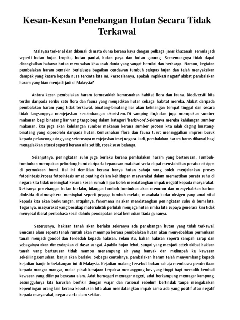Kesan Kegiatan Penebangan Hutan terhadap Tumbuh-tumbuhan Semula Jadi dan Hidupan Liar. Oleh Kerajaan dan orang ramai haruslah berganding. This document was uploaded by user and they confirmed that they have the permission to.